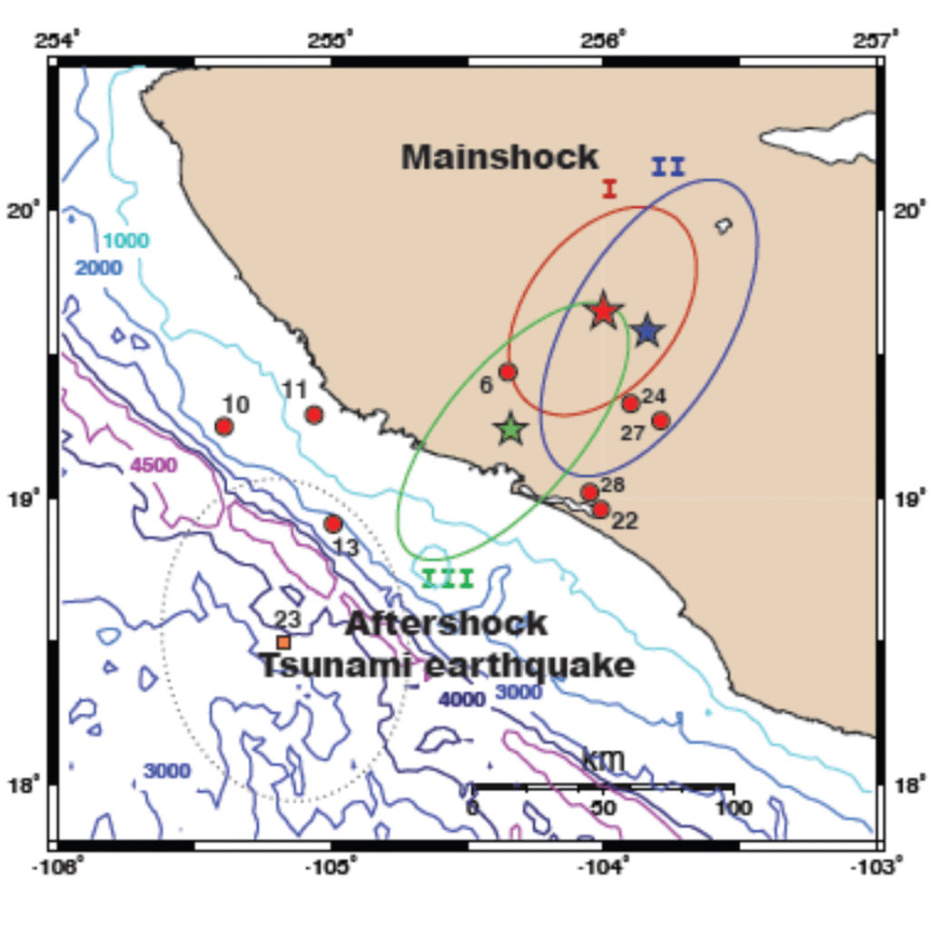 Epicentros del sismo principal y réplicas de Colima de 1932
