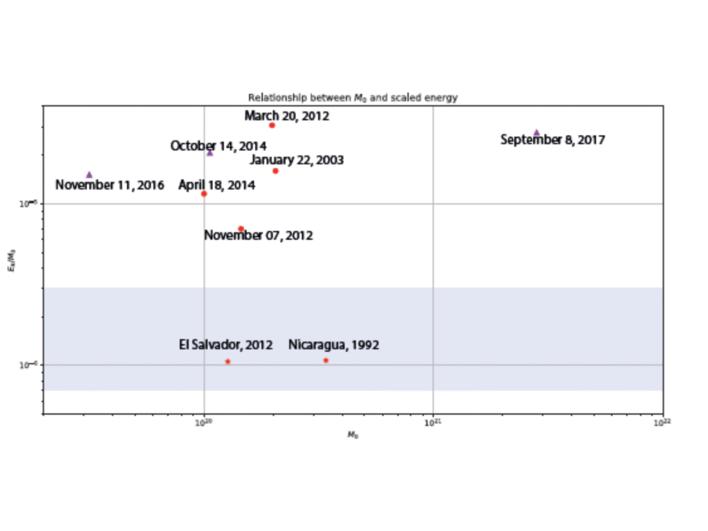 Para identificar posibles sismos tsunami, se estima la energía sísmica radiada (ER) a partir de ondas-P telesísmicas utilizando la metodología propuesta por Pérez-Campos et al. (2003), y se utilizan valores de momento sísmico (MO) de la Solución CMT Global (solución global del tensor de momento centroide).